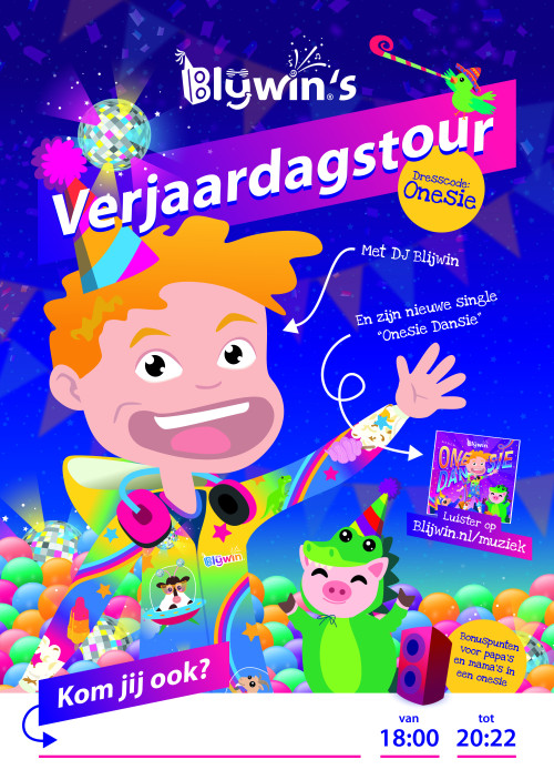Op woensdag 2 Maart vanaf 18.00 gaat het dak eraf en deze dag blijven we dan ook langer open tot 20.22 uur. Naast de gebruikelijke entrée van de BubbelJungle hoef je niks extra's te betalen. Wel mogen de kinderen voor één keer in hun onesie-outfit komen. Net als DJ-Blijwin zelf.